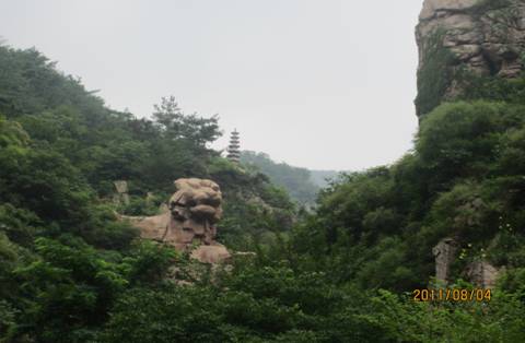 山林路轉(zhuǎn),一處陡峭的木質(zhì)階梯吸引了大家的眼球,一端階梯下溪水緩緩的流著,另一端的階梯入了云端,順眼望去一頭猛獅駐足山頭,更遠(yuǎn)處是一道觀,遠(yuǎn)遠(yuǎn)望去能看見它的宏偉,不難想象昔日的繁華,與對面的高山形成一道別致畫面。